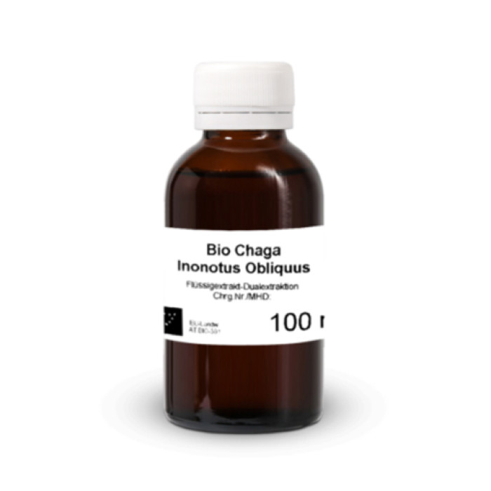 Die Chaga-Pilze werden auf zertifizierten Rohstoffen, die zu 100 % aus der Bio-Landwirtschaft stammen, angebaut und nach der Ernte schonend getrocknet, um die Inhaltstoffe möglichst weitgehend zu erhalten. Im nächsten Schritt erfolgt die alkoholische Extraktion. Als Extraktionsmittel verwenden wir nur reines Bio-Ethanol, gebrannt aus biologisch angebautem Getreide. Dieser Extraktionsschritt dauert mehrere Tage während dieser sich die alkohollöslichen Inhaltsstoffe aus den Pilzen lösen, danach werden die Pilze abgefiltert und für den nächsten Extraktionsschritt vorbereitet. Der Alkohol aus dem Extrakt wird durch Destillation verdampft, damit das Endprodukt alkoholfrei ist. Im nächsten Schritt werden die verbliebenen Pilze mit Wasser extrahiert, bei diesem Prozess werden die wasserlöslichen Stoffe aus dem Pilzmaterial gelöst. Am Ende des Produktionsprozesses werden die beiden Extrakte vereint und mit pflanzlichem Bio-Glycerin aus Sonnenblumenkernen homogenisiert. Glycerin ist ein vollständig körperfreundlicher Stoff, der die Vitamin- und Mineralstoffmoleküle umschließt und verhindert, dass Qualitätsmängel die Inhaltsstoffe während der Lagerung beeinträchtigen. Außerdem unterstützt Glycerin die Resorption, so dass wertvolle Inhaltsstoffe auch bei Darmproblemen resorbiert werden können und es verleiht dem Flüssigextrakt einen angenehmen Geschmack.